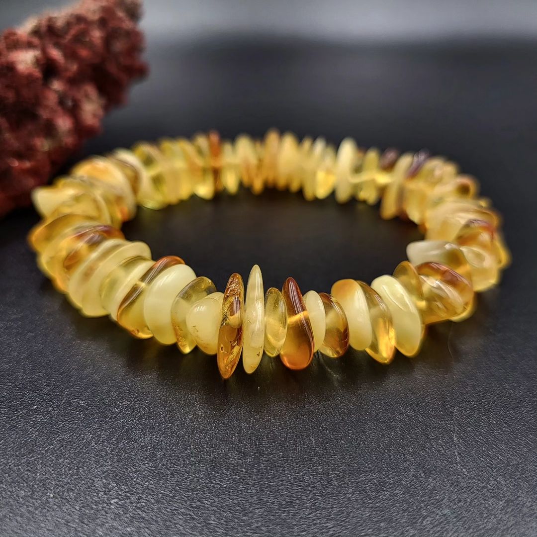 The bracelet features a mix of smooth, chips amber beads in shades of warm yellow and honey brown.